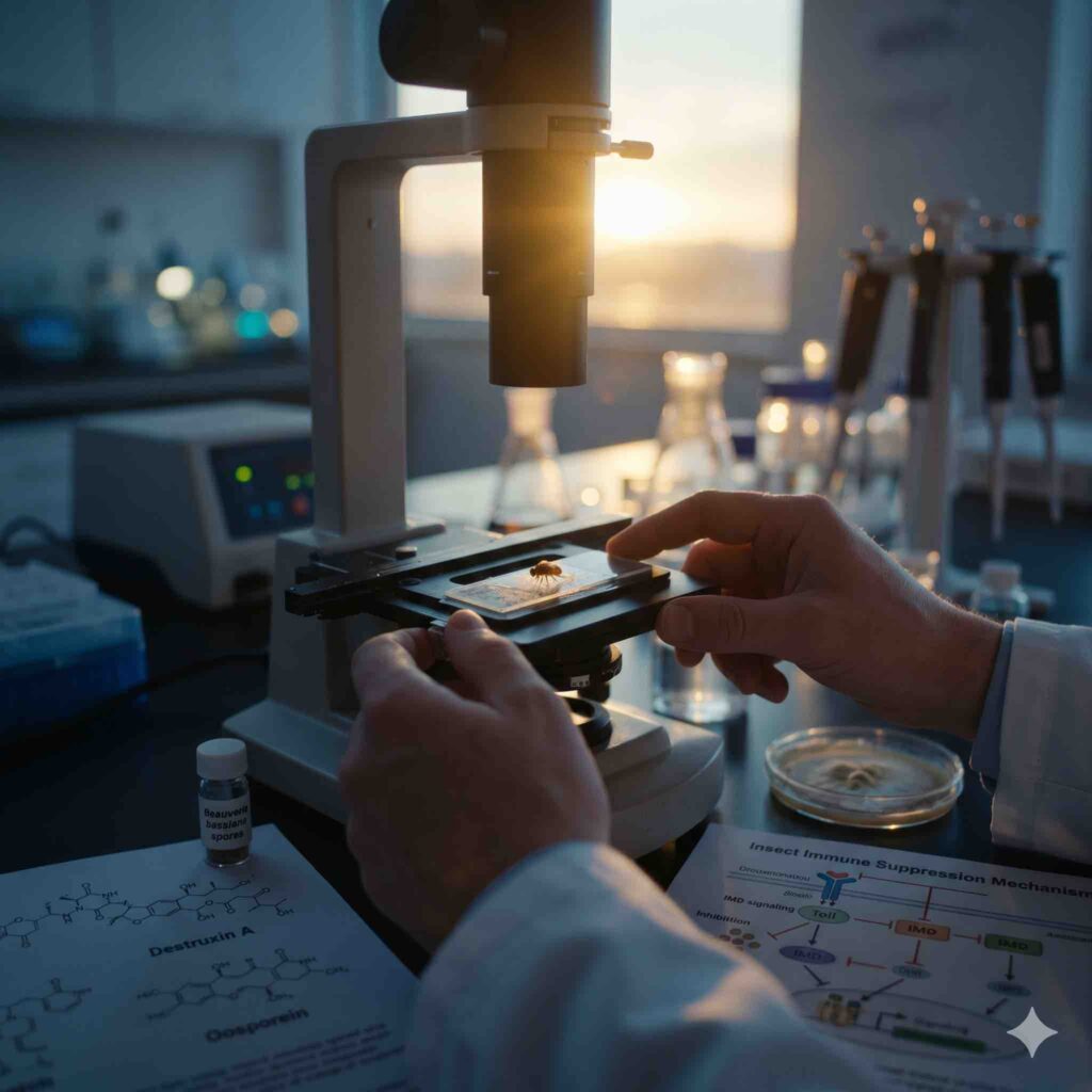 논문은 진균의 이 미시적 무기들이 곤충 면역의 거의 모든 단계에 개입하는 기전을 생생하게 묘사한다. 세포성 면역 단계에서는 혈구세포의 응집을 막고 사멸을 유도하며 식세포 작용을 억제한다. 체액성 면역 단계에서는 AMP(항균 펩타이드) 생산을 저해하고 PO(Phenoloxidase) 활성을 억제하여 멜라닌화와 상처 치유를 차단한다. 심지어 장내 상피세포의 면역 항상성까지 파괴하여 전신 감염을 촉진한다. 이 모든 것이 단 몇 가지의 정교한 SMs, 예를 들어 Destruxins, Oosporein, Bassianolide, Cordycepin 등의 화학적 조작을 통해 일어난다.