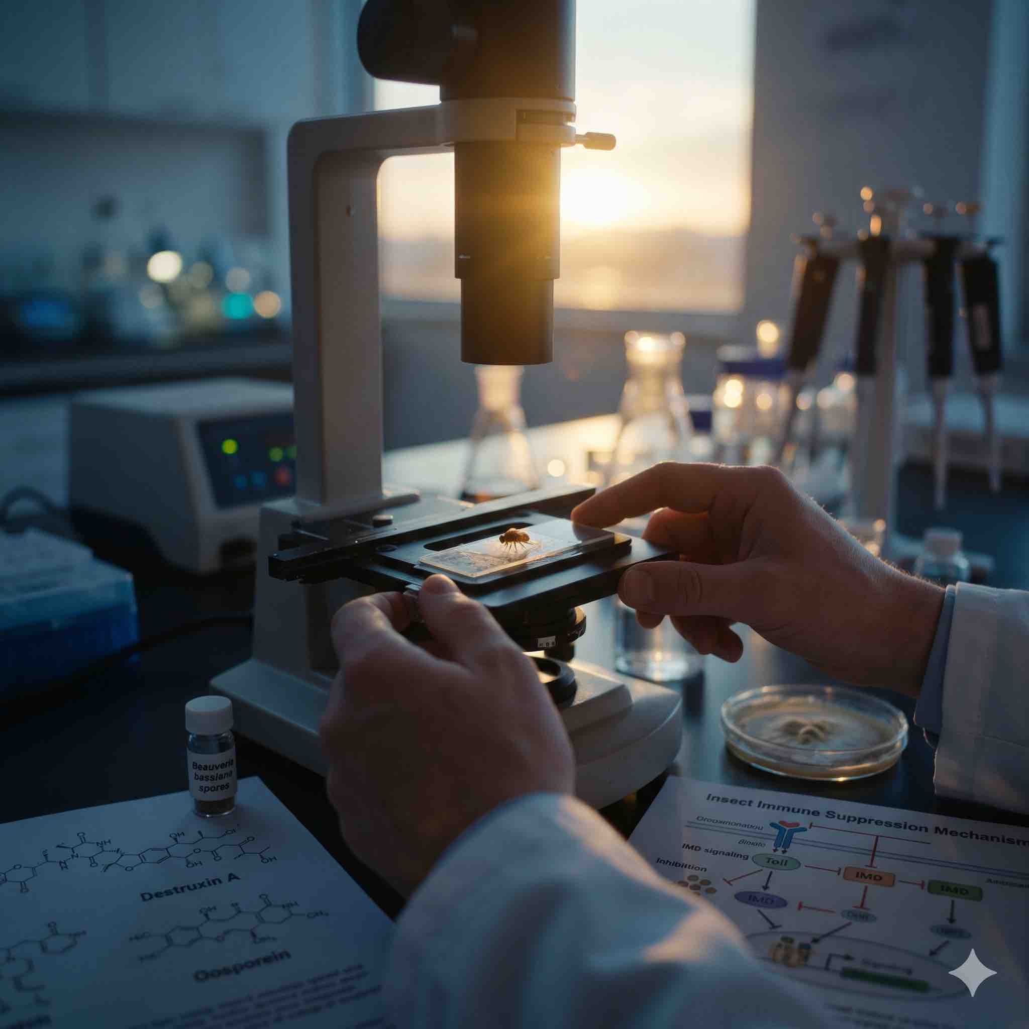 나는 초파리의 미시 세계를 탐험하는 사람이다. 내 실험실에서 우리는 초파리의 신경계와 행동의 유전적 지도를 그리며, 때로는 꿀벌의 면역 시스템을 보호하기 위한 작은 실마리를 찾기도 한다. 그러나 때때로, 내 연구의 경계를 넘어 전혀 다른 분야의 연구를 접하게 될 때, 나는 기초과학의 위대함과 그 연결성을 새롭게 깨닫는다. 최근에 접한 이 리뷰 논문, “살충성 진균의 다기능 분자 무기와 곤충 면역 억제에 대한 새로운 기전적 통찰”은 나에게 그런 충격을 주었다.